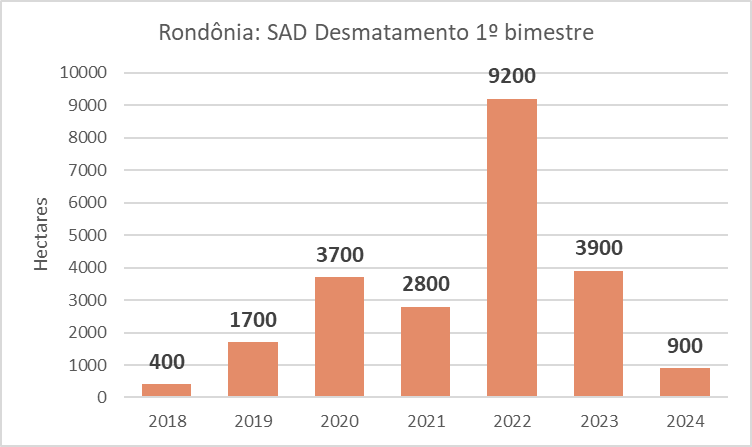 O Sistema de Alerta de Desmatamento (SAD) do Imazon indicou que houve uma devastação da floresta de 900 hectares de floresta no estado de Rondônia nos primeiros dois meses deste ano (2024). Um resultado menor que nos últimos cinco anos.