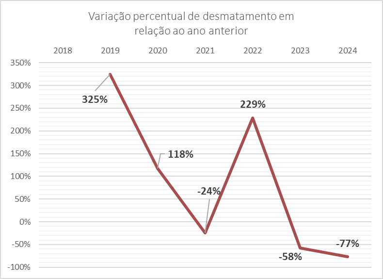 Houve uma variação de -77% nos dados quando comparados aos dados do primeiro bimestre de 2023. O gráfico a seguir indica a variação do percentual de desmatamento em relação ao ano anterior, comparando os dados entre os anos subsequentes.