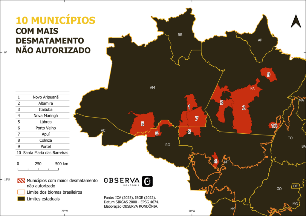 The report highlights the ten municipalities with the highest rates of illegal deforestation in the Amazon biome, each exceeding 100 km2 of cleared land. Three of them are located in the state of Amazonas (Novo Aripuanã, Apuí and Lábrea), four in Pará (Itaituba, Altamira, Portel and Santa Maria das Barreiras), two in Mato Grosso (Colniza and Nova Maringá) and one in Rondônia (Porto Velho).