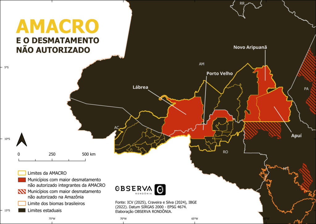Among these, four are located within the AMACRO zone: Porto Velho, Novo Aripuanã, Apuí and Lábrea. In addition, Colniza in Mato Grosso, which borders the AMACRO, is also on the list. These results point to an intensifying wave of illegal deforestation in the Amazon, thus reinforcing the thesis of AMACRO being the New Arc of Deforestation, tied to the ongoing expansion of agribusiness.