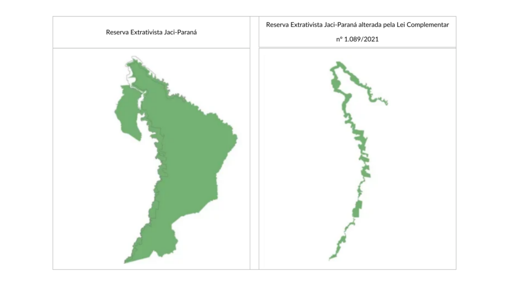 O Executivo Estadual reduziu a área da unidade de conservação em três momentos por meio de Lei Complementar, a primeira vez em 2011, excluiu mais de 2.240 hectares; a segunda em 2018, excluiu 467 hectares; e a terceira, publicada em 2021, excluiu mais de 159.815 hectares do território da Resex. A última alteração de limite, a Lei Complementar nº 1.089/2021, reduziu 78% da unidade de conservação, o que faria restar apenas a área de preservação permanente no interior da unidade. Em resposta, foi declarada a inconstitucionalidade da lei estadual pelo TJRO e revogada a decisão do executivo.