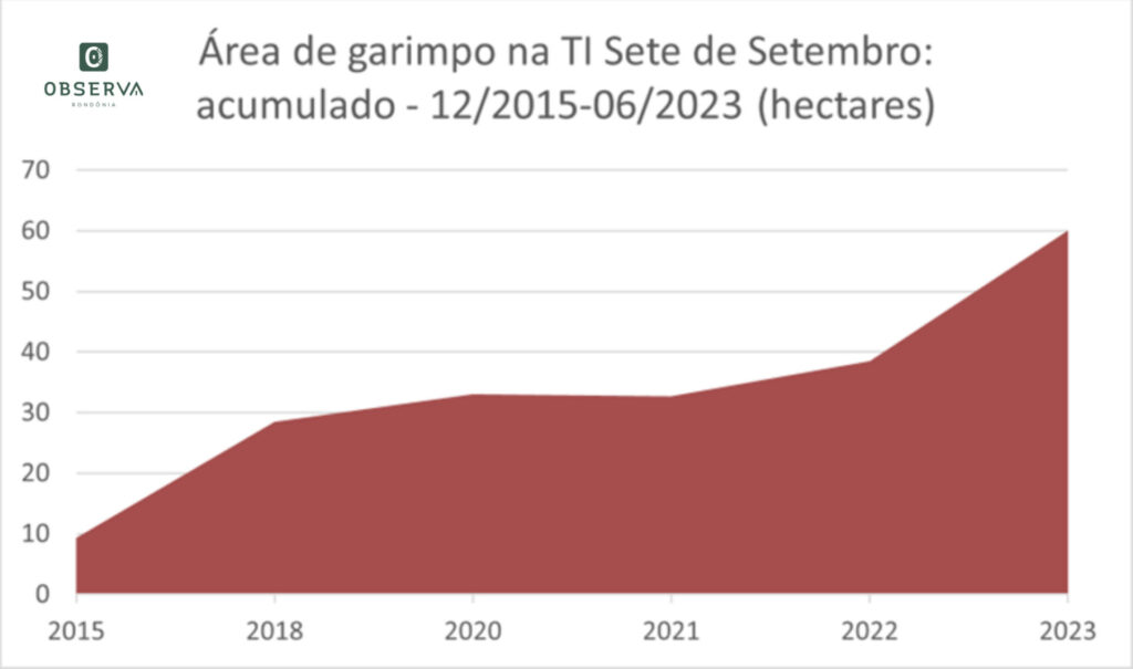 Gráfico da evolução da área de garimpo na T.I. Sete de Setembro acumulado entre 2015-2023.