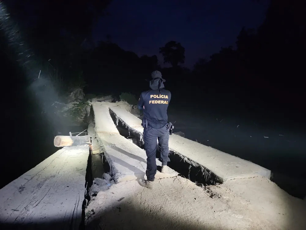 Pontes usadas no escoamento de minérios e madeiras retirados de terras indígenas foram destruídas na operação. Foto: PF/Divulgação.